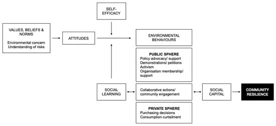 Drawing together these elements, we develop a framework linking individual attitudes and behaviours to collective outcomes. The framework is presented in Figure 1. Individual VBNs influence attitudes, which, mediated by self-efficacy and social learning, drive environmental behaviours in the public and private spheres. Public sphere behaviours contribute to the development of social capital, which increases community resilience and feeds back to an increased understanding of environmental risks, self-efficacy and social learning.