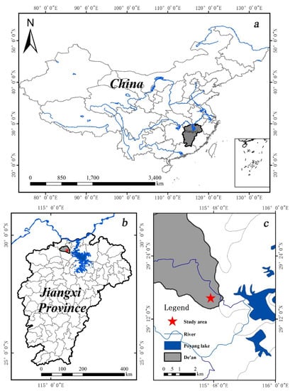 The location of the study area in the center of the red soil region in southern China. The study site was 15 km west from Poyang Lake, which is the largest freshwater lake in China. Three pictures show the study area: (a) A map of Jiangxi province in China; (b) the study area in Jiangxi province; (c) the position of the study area opposite the river system.