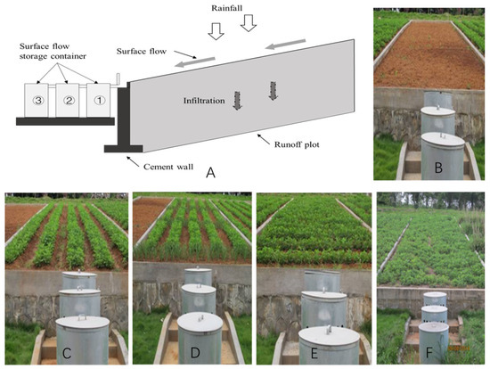 Schematic diagram of the runoff plot (A) and photos of the four runoff plots: bare land (B), slope tillage (C), slope tillage + hedgerows (D), contour tillage (E), and conventional tillage + straw mulching (F).