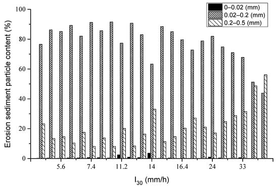 Figure 5 shows the relationship between the particle composition and I30 during precipitation in the exposed plots of sloping farmland in 2018. It can be seen that with the increase in I30 in the next rainfall, the coarse sand content increases, the fine sand content decreases, and the viscosity and powder content do not change significantly. When I30 is larger than 14 mm/h, the coarse sand content increases with increasing I30, and the fine sand content decreases accordingly. With the increase in the secondary rainfall I30, the kinetic energy and runoff of the rainfall increase, and the kinetic energy of runoff on the slope increases, so the coarse sand content increases. When rainfall I30 is small, the runoff carrying capacity is small, and the gradation distribution of the sediment particles does not change significantly. When I30 reaches 14 mm/h and the rainfall kinetic energy is large enough, the runoff carrying capacity increases significantly and the content of coarse sand that is transported continues to increase, resulting in an increase in the amount of coarse sand.