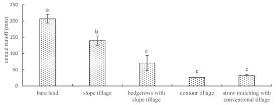 An analysis of the annual average runoff depth under the five treatments of sloping farmland, slope tillage, hedgerows with slope tillage, contour tillage, and straw mulching with conventional tillage from 2015 to 2018 is shown in Figure 6. It can be seen that the runoff depth, in descending order, is from bare to large, slope tillage, hedgerows with slope tillage, straw mulching with conventional tillage, and contour tillage. According to the t-test, the runoff depth of the bare land is significantly greater than that of the other treatments. The slope tillage is 32.56%, and the runoff depth of the slope tillage is significantly greater than that of hedgerows with slope tillage, contour tillage, and straw mulching with conventional tillage. The flow-reducing effects of hedgerows with slope tillage, straw mulching with conventional tillage, and contour tillage relative to slope tillage were 49.38%, 76.27%, and 81.17%, respectively. The above analysis shows that increasing the ground cover after planting crops on sloping land can significantly reduce surface runoff, and further adopting soil and water conservation measures can significantly reduce surface runoff.