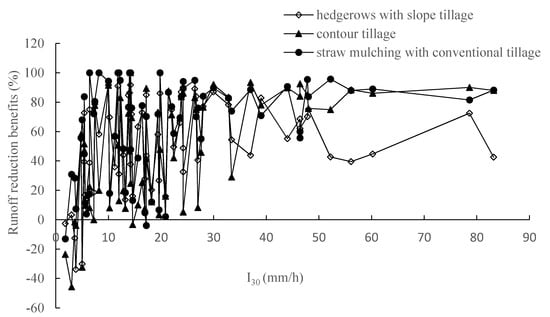 Comparing hedgerows with slope tillage, contour tillage, straw mulching with conventional tillage and slope tillage in the four-year sloping farmland from 2015 to 2018, we analyzed the flow-reduction effects of different soil and water conservation measures under different I30 ranges, as shown in Table 2. It can be seen that the flow-reduction effect of the plant hedge first increases and then decreases with the increase in I30. The flow-reduction effect of contour tillage and straw mulching with conventional tillage increases with the increase in I30. The standard deviation of the flow-reduction effect of different measures decreases with increasing I30. When I30 is less than or equal to 20 mm/h, the flow-reduction effect of soil and water conservation measures is small, and the standard deviation is large. When I30 is greater than 20 mm/h, the flow-reduction effect becomes large, and the standard deviation decreases. The above analysis shows that different water and soil conservation measures have different I30 ranges, and the flow-reduction effects vary significantly. Contour plant hedges mainly use hedges and plants to intercept runoff, and the gap between hedges is large. The effect is obvious when I30 is in a small range. After I30 is greater than 40 mm/h, the kinetic energy of the rainfall is large, the runoff is large, and its reducing effect is gradually weakened. The contour tillage has a constant height ridge every 0.3 m, the ridge is dense, and the flow-reduction effect increases with the increase in I30.