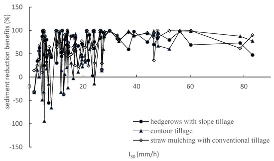 We conducted a comparative analysis of different soil and water conservation measures under different I30 ranges on the effects of sand reduction on hedgerows with slope tillage, contour tillage, straw mulching with conventional tillage, and slope tillage in 2015–2018. Table 3 shows that the flow-reduction effects of hedgerows with slope tillage, contour tillage, and straw mulching with conventional tillage all increase with increasing I30, and the standard deviation decreases with increasing I30. The ranking of the overall effect of sediment reduction by different measures is straw mulching with conventional tillage, contour tillage, and hedgerows with slope tillage. When I30 is 0–20 mm/h, contour tillage is the smallest, which indicates that contour tillage is not as good as hedgerows with slope tillage under the conditions of less I30 rainfall, and straw reduction measures have higher effects under different rainfall conditions.