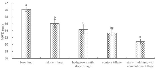 The average analysis of the MWD of the five types of sloping farmland for the next rainfall erosion is shown in Figure 10. The MWD of erosion and sediment under different treatments are in the order of bare land, slope tillage, hedgerows with slope tillage, contour tillage, and straw mulching with conventional tillage. According to the t-test, the MWD of slope sediment erosion is significantly smaller than that of bare land. The MWD of hedgerows with slope tillage and contour tillage are significantly smaller than that of slope tillage, and the MWD of straw mulching with conventional tillage is significantly smaller than that of slope tillage and hedgerows with slope tillage. The above analysis shows that, after planting crops on sloping farmland, the erosion and sediment MWD can be significantly reduced. After soil and water conservation measures are adopted on sloping farmland, the MWD in eroded sediment can be reduced. Straw mulching with conventional tillage has the best effect on reducing the MWD of eroded sediment particles and can achieve significant effects.