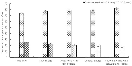 The grading analysis of the different particle size distributions of erosion sediment from the five types of sloping farmland during the next rainfall is shown in Figure 11. It can be seen that the content of coarse sand (0.2–0.5 mm) in the eroded sediment of sloping farmland is the largest in the order of bare land followed by slope tillage, the difference between hedgerows with slope tillage and contour tillage is not the same, and straw mulching with conventional tillage is the lowest. Compared with bare land, the increase in coarse sand content along slope tillage, hedgerows with slope tillage, contour tillage, and straw mulching with conventional tillage was 12.11%, 19.04%, 18.49%, and 31.12%, respectively. The content of fine sand (0.02–0.2 mm) in the eroded sediment is the largest in straw mulching with conventional tillage, the second-highest represents the difference between contour tillage and hedgerows with slope tillage, the third-highest is in slope tillage, and the lowest is in bare land. Compared with bare land, the increase in fine sand content in slope tillage, hedgerows with slope tillage, contour tillage, and straw mulching with conventional tillage was 4.02%, 6.34%, 6.40%, and 10.36%, respectively. There was no significant difference in the thickness and particle size of the erosion and sediment (0–0.02 mm) between different treatments, but the content of fine sand with straw mulching with conventional tillage content was still the largest. The above analysis shows that, after planting crops on sloping land, the ground coverage is increased and the kinetic energy and runoff energy of rainfall are reduced, which reduces the runoff and sand transport capacity, resulting in a reduction in the coarse sand content. After taking soil and water conservation measures on sloping farmland, the soil and water conservation measures will further intercept runoff energy and further reduce the transport of coarse sand. Among soil and water conservation measures, straw mulching with conventional tillage is best at intercepting coarse particles.