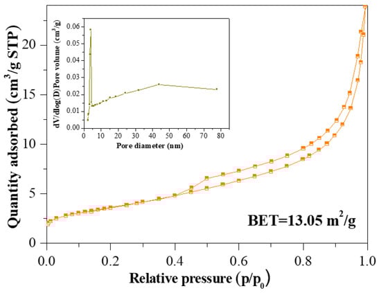 As shown in Figure 2, the nitrogen adsorption–desorption isotherms of ZFA show a type IV isotherm with an H3 hysteresis loop according to the classification of the International Union of Pure and Applied Chemistry (IUPAC). The nitrogen adsorption–desorption isotherms had a larger hysteresis loop at higher relative pressure (P/P0), suggesting the presence of plentiful mesopores in zeolite [23]. BET () analysis demonstrated that the specific surface areas of ZFA and raw fly ash were 13.05 m2/g and 0.34 m2/g, respectively. The average pore size and pore volume of ZFA were about 11.19 nm and 0.04 cm3/g, respectively. Thus, the synthetic zeolite can effectively adsorb ammonium that can freely enter and exit the channel, which facilitates mass transfer diffusion.