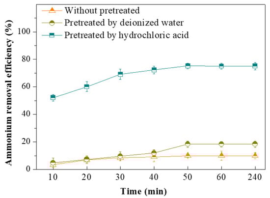 The pretreatment methods on ammonium removal by the synthetic zeolite (C0 = 100 mg/L; adsorbent dosage = 10 g/L; pH = 7.0; T = 25 °C).