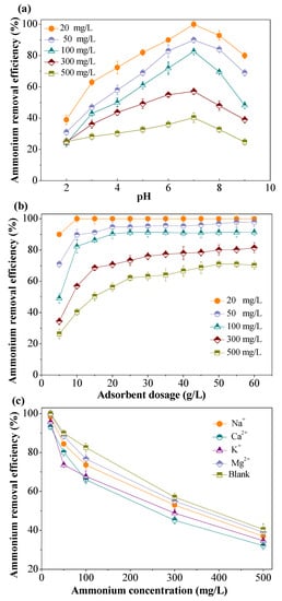 Effect of (a) pH, (b) adsorbent dosage, and (c) cations on the removal of ammonium (T = 25 °C).