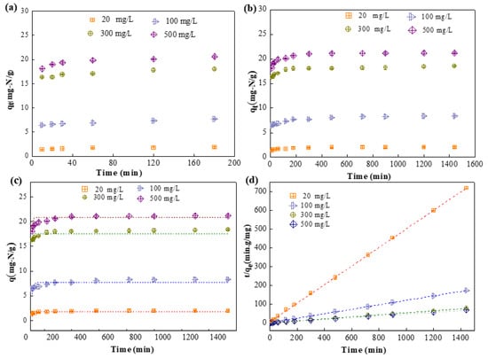 (a,b) Ammonia nitrogen adsorption dynamic by the synthetic zeolite; (c) adsorption kinetics fitted with a pseudo-first-order and (d) a pseudo-second-order model (pH = 7; T = 25 °C).