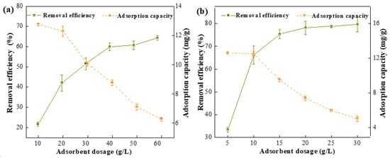 Effect of adsorbent dosage on the ammonium removal from swine wastewater by the synthetic zeolite: (a) raw swine wastewater; (b) effluent from the biochemical unit.