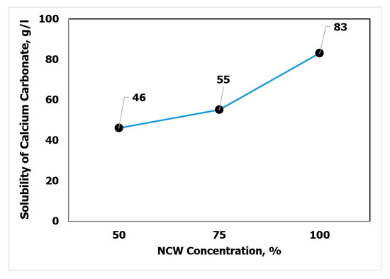 To assess the effect of the NCW concentration on solubility, two different mixtures diluted with deionized water were prepared. In particular, 50 and 75 vol.% of the washing solution were prepared and the solubility was determined at 212 °F. Figure 3 shows that the maximum solubility was obtained when no further dilution was made. This was due to the reduction of the acid concentration that yielded less solubility. Therefore, 100% of NCW is to be used in subsequent treatments.
