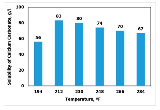 Figure 4 shows the CaCO3 solubility over a wide range of temperatures. It could be observed that the maximum solubility was achieved at 212 °F, where around 83 g/L of calcium carbonate was dissolved. Further increase in the temperature resulted in decreasing the solubility. This could be due to a reduction in the retardation effect by the mutual solvent. Consequently, the solubility of the whole formulation decreased.