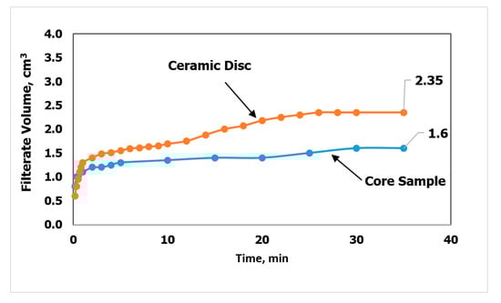 An HPHT filter press was used to build the filter cake on a ceramic disc, and again on a 2.5 inch Berea sandstone core for 30 min at 212 °F and 300 psi. Figure 5 illustrates the filtration over time, it is noticeable that in both materials the fluid generated the filter cake within 30 min and the total filtration volumes were relatively small and less than 2.5 cubic centimeters. Figure 6 shows the generated filter cake on the core and the ceramic disc. The thickness of the filter cake was 1.2 mm and 1.5 mm on the ceramic disc and the core, respectively.