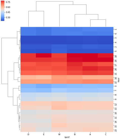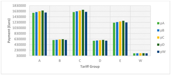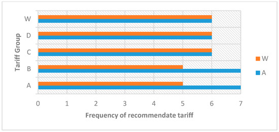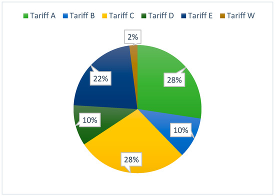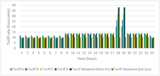 C and D are remarkable by higher peak rates and lower off-peak rates, also W tariff has a higher peak rate from Monday to Friday, but constant low rate during weekend days. Such tariffs reward consumers that shift their consumption from peak to off-peak intervals. On the other hand, A and B are less rewarding, but their peak rates are also less penalizing.