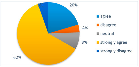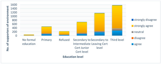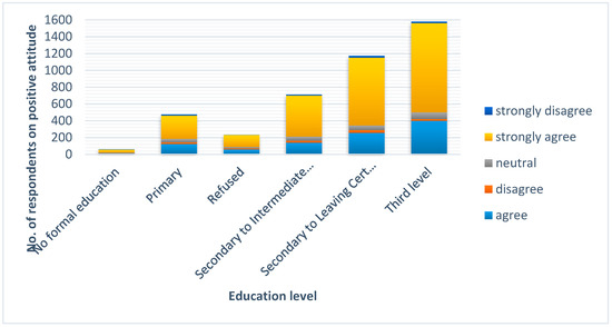 Figure 7 shows the attitude of the respondents on education levels that reacted to the statement “I/we am/are interested in changing the way I/we use electricity if it helps the environment”. In this case, the answers were also well polarized around “strongly agree” and “agree”. Only the neutral answers are more often than in the previous figure.