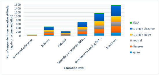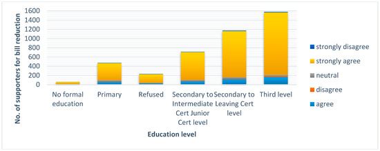 Figure 5 shows the attitude of the respondents on education levels that reacted to the statement “I do not want to be told how much electricity I can use”. The answers were less polarized, whereas the proportions of the respondents that strongly disagreed or strongly agreed are not very different.