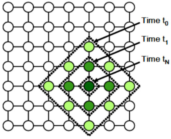 To obtain the best pair of the input vector with the weight vector , the products will be calculated and the largest one will be selected, a method which is equivalent to minimizing the Euclidean distance between and . The result will identify the topologic region (neighborhood) where the excited neurons are centered. Identifying the index of the neuron that best matches the input space means the fulfillment of the following condition: