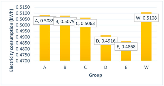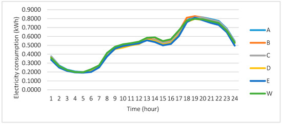 The test groups that each corresponds to a ToU tariff were set to DSM, while the control group was billed as before with the flat tariff (tariff E equals 14.1c/kWh). Four three-level ToU tariffs and one tariff for weekend (W), as in Figure 1, were created and applied for residential consumers.