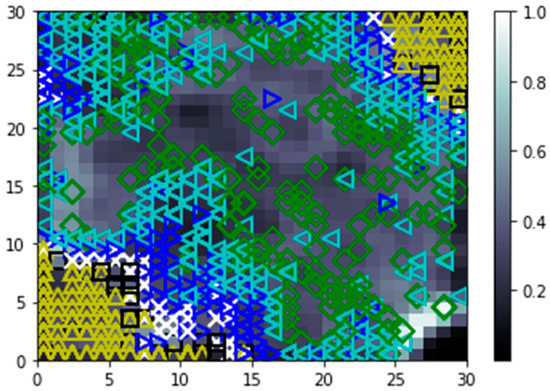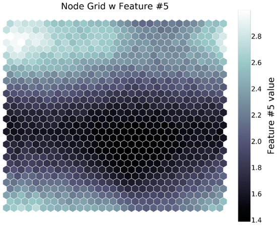 Map of nodes colored in accordance with the fifth feature on a 30x30 map.
