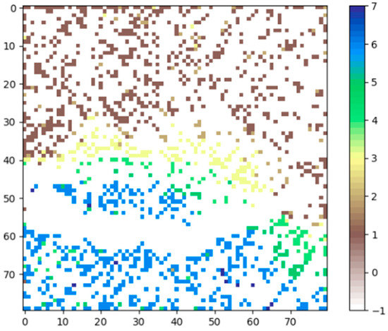 This set of questions also contains questions linked to the electricity monitor, from the evaluation of the time of understanding of the device’s operating mode (1:very easy, and 6:very difficult) to the bill evaluation in terms of electricity consumption. It can easily be observed that questions with a similar response (black squares as in Figure 41) have been arranged by the neural network very close to each other. Black squares represent the answer to the question codified by 5—which means strongly agreed or very satisfied with the outcomes. The default color for missing values (zeros) was red colored, but it was removed for a better and more understandable representation. Incidentally, other answers are represented close to each other (1-green, 2-cyan, 4-white,3-blue, 6-yellow). The white ones are in immediate closure to the black squares, which means the network identified correctly groups of respondents that agree or are satisfied with the electricity monitor and may consider that over the trial the amount of electricity was reduced. Other markers—blue, green and cyan are also close to each other, but more scattered over the map, which means that some of the respondents have strong beliefs in report to some situations or questions, but they disagree on other statements.
