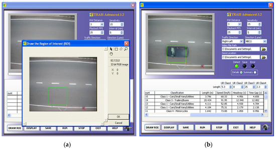 Interfaces of the image processing software (a) region of interest (ROI) box; (b) vehicle detection.