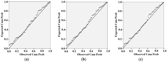 However, regression analysis requires the assumption that the residual (error) is normally distributed with a zero mean and constant variance to obtain the best model. Residual analyses were then conducted to check these assumptions. A normal probability plot can be used to test whether the error terms are normally distributed or otherwise and presents a plot of a variable’s cumulative proportions (the proportion of the distribution that is less than the specified value) against the cumulative proportions of a theoretical normal distribution. If the error terms are normally distributed, the points cluster around a 45° straight line. The normal probability plots generated for Models 1, 2, and 3 using statistical software are shown in Figure 4. Based on the results, the data points are distributed roughly around a 45º straight line, thus indicating that the normality assumption for each model is satisfied.