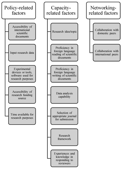 Prior literature has shown the importance of governmental as well as institutional policies in the research outcomes of faculty members [1,32]. Therefore, it is not surprising that our sampled panelists emphasized the role of “policy-related factors” in their success in international publishing, including: “Accessibility of international scientific documents” (item 2); “Input research data” (item 4); “Experimental devices or tools, software used for research purposes” (item 5); “Accessibility of research funding” (item 8); “Time available for research purposes” (item 9).