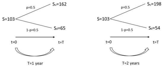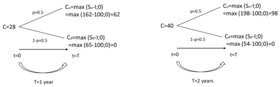 Again, we account for two cases, where in the first case the time to maturity is one year (T = 1), and in the second case, two years (T = 2). In the first RO-strategy case, by applying the risk-neutral probability measure, the expected value of the project, seen as a call option, at t0 is C = (0.5 × 62 + 0.5 × 0) × e-0.1 = 28. Therefore, the expected payoff from the project, i.e., the expanded NPV including the value of the option to postpone the opportunity to invest in 1 year-time, net of the cost of the option, is 8. This is higher than the expected payoff from the NPV-strategy ceteris paribus (8 > 3). In the second RO-strategy case, respectively, the expected value of the project at t0 is C = (0.5 × 98 + 0.5 × 0) × e-0.1×2 = 40. Therefore, the expected payoff from the project, i.e., the expanded NPV including the value of the option to postpone the opportunity to invest in 2 years-time, net of the cost of the option, is 20. We note that the expected payoff from the RO-strategy in the second case is (considerably) higher than that from the NPV-Strategy in the second case (20 > 3).