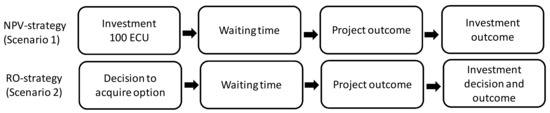 27]. In this research, we concentrate on the “option to wait”—that is, the possibility to postpone an uncertain decision (to invest) to a future time. The option to postpone decision-making is a typical real-world real option that allows managers an element of control over the risk of uncertain investments and supports sustainable decision-making. The time that is waited is often used to find out more about the uncertain situation, and the option to wait becomes an option to learn. Investing only after (a part of) the uncertainty has been resolved allows for less risky and more resource efficient, and hence economically more sustainable, decision-making. The value of the option to wait has been discussed previously also in this journal in the context of having inter-temporal flexibility in starting a rental housing investment [