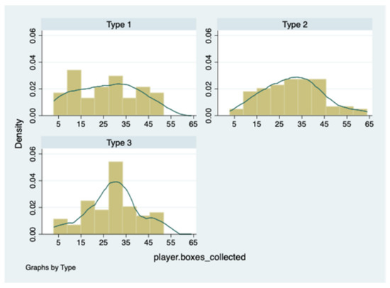 Figure 5 illustrates the distribution of number of collected boxes in BRET across types. On average, Type 1, Type 2, and Type 3 collected, respectively, 26, 31, and 29 boxes.