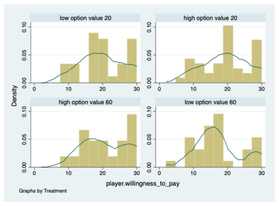 By means of Mann–Whitney tests, we find that the WTPs are significantly higher in the treatment with long real experimental time and high option value (high option value 60) than in the treatment again with long real experimental time but with low option value (low option value 60) (Mann–Whitney test, p = 0.025). Additionally, we confirm that the WTP in the treatment with low option value and short experimental time (low option value 20) is significantly higher than the WTP in the treatment with low option value and high experimental time (low option value 60) (Mann–Whitney test, p = 0.049).