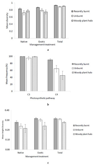 Functional diversity: To compare the functional diversity (the diversity of functional traits) of species in response to the three management treatments—unburnt (competitive environments), areas within woody plant halos (stressed environments) and recently burnt (disturbed environments)—community trait-weighted means were calculated using a modified Mason index [63] to compare the overall variation of trait values for plant height (cm), seed mass (mg), specific leaf area (SLA) (mg/mm2) and leaf dry weight (mg). A modified Rao index of diversity [63] was also calculated to measure the dissimilarity of traits between species for plant height (cm), seed mass (mg), SLA (mg/mm2), leaf dry weight (mg), life span (annual/biannual or perennial) and life form (a ten-point classification based on the Raunkiaer life form categories) [66]. The differences in the frequency of C3/C4 photosynthetic pathway of graminoids between management treatments were analysed using a one-way ANOVA and Bonferroni Post Hoc procedure based on the total species pool and native and exotic species separately to better understand the effects of the treatments on the threatened ecological community (only native species are protected).