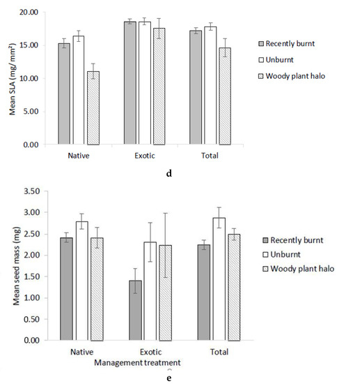 Mean species SLA was significantly lower in woody halos compared to unburnt areas (F2,34 = 0.02; Figure 1d). Differences in SLA are driven by native species, with native species SLA being significantly lower in woody halo areas compared with unburnt areas (F2,34 = 9.47, p = 0.000; Figure 1d) and recently burnt areas F2,34 = 9.47, p = 0.01). Mean species seed mass in unburnt areas was significantly lower in recently burnt areas (F2,34 = 3.51, p = 0.04; Figure 1e). These were the only significant difference recorded between the management treatments for community trait-weighted means.
