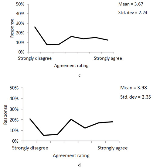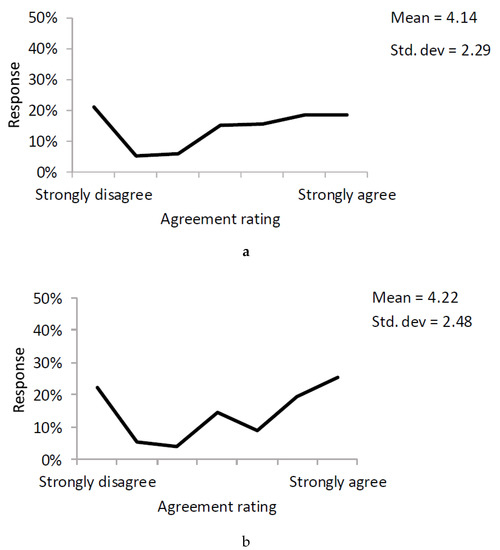 Attitudes toward grasslands and acceptability of management actions were examined using frequency distributions, a simple but effective way of interpreting public views [72]. The shape of response frequency distributions was interpreted based on methods by Ribe [22]. A uni-modal distribution with one peak describes public consensus. A bi-modal distribution with two peaks describes conflicted public opinion. The overall level of acceptability is determined by the mean of the distribution.