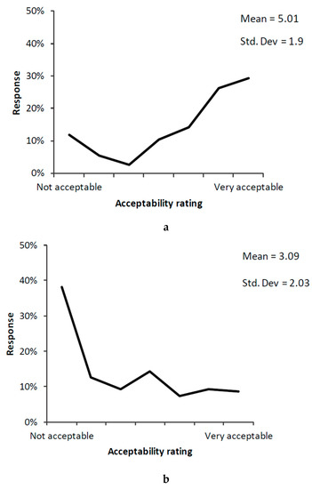 Frequency distribution of acceptance ratings for (a) using prescribed burning as a management tool (n = 425) and (b) removing trees and shrubs from grasslands in cities (n = 418).
