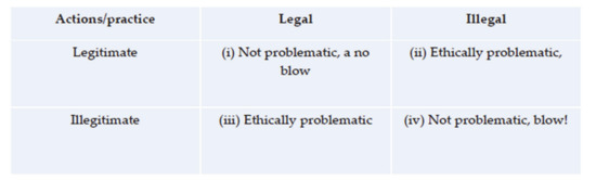 The motivation or practice to report corruption or other perceived wrongdoings outside a workplace can also be interpreted in the terms personal ethical considerations or deliberation, which can be afflicted by a reward system. MacIntyre [37] argued that a practice is a “coherent and complex form of socially established cooperative human activity through which goods internal to that form of activity are realized in the course of trying to achieve those standards of excellence which are appropriate to, and partially definitive of, that form of activity, with the result that human powers to achieve excellence, and human conceptions of the ends and goods involved, are systematically extended.” (p. 187). Within personal perspectives there are always choices, and in an organization, there are often multiple options. The individual must to some extent makes individual value judgments before reporting or using internal procedures or external resources. Such an ethical discourse can be seen along the two continuums of legal versus illegal and legitimate and illegitimate. We have expressed this theoretically in a descriptive four columns ethic model (Figure 1).