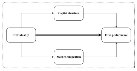 CEO duality is a phenomenon where the chief executive officer of a company occupies the chair of the company’s board of directors, along with his/her regular management position [1]. Recognition of the effect of CEO duality on firm performance has attracted much attention from research scholars [2,3]. Previous research investigating the impact of CEO duality on enhanced firm performance provided mixed results. The outcomes of the current literature are inconclusive, ranging from positive to negative, and sometimes indicating an insignificant relationship between CEO duality and firm performance [4,5,6,7]. Scholars arguing a negative association between CEO duality and firm performance support their findings based on agency theory. According to this theory, a CEO with a dual role does not work for shareholders’ interest; instead, the CEO decides to maximize his/her personal benefits, which ultimately leads to agency problems [8], thereby resulting in an adverse performance of the firm [9,10]. On the other hand, researchers supporting the positive impact of CEO duality on firm performance refer to stewardship theory to support their stance. Stewardship theory assumes that the dual role of a CEO endorses a more concentrated and flexible governance structure, which enhances the managerial efficiency in dynamic business surroundings [11,12], thereby leading to high firm performance. In the face of these controversial findings, it is crucial to conduct an in-depth analysis by considering additional factors that underlie the relationship between CEO duality and firm performance. Subsequent studies have advocated that the intervening or mediating variables among the CEO duality and firm performance relationship must be investigated to reveal how CEO duality influences a firm’s performance [6,13]. However, studies have primarily not investigated the mediating factors to explain this effect [14]. This study proposes capital structure and market competition as the two parallel mediating mechanisms to explain how CEO duality influences firm performance, and thus attempts to fill this gap in the literature.