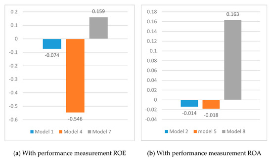 In order to test the CEO duality relationship with firm performance, we employed the GMM model. To test our mediation hypothesis, we used the procedure outlined in [76], in which the authors discussed some steps in establishing a mediation role. First, a significant relationship between the dependent and independent variables is required. For the dependent and independent variable associations, we developed two models with performance measurements, namely, ROE and ROA, respectively. Second, a significant relationship is required between the independent and mediating variables, and for this association, we developed Model 3 and Model 6. Model 3 describes the CEO duality and capital structure association, while Model 6 describes the CEO duality and market competition relationship. Third, the dependent variable is regressed on both the independent and the mediating variable, and the mediator must affect the dependent performance of the firm.