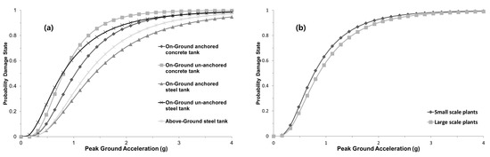 Fragility curves for the (a) tank and (b) pump (data from ALA, 2001 [33]).