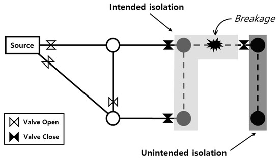 The restoration and replacement of pipes damaged by an earthquake usually proceed after the area is isolated from the system by shutting off the valves adjacent to the damaged pipe. In this case, as shown in Figure 3, the service suspension area—in which the water supply, along with the broken pipe, is cut off—is defined as an IIA, and the area where water supply is unintendedly cut off from the water source because of isolating the IIA is defined as the UIA [23]. That is, when the water supply zone is blocked by shutting off the valve for the restoration of the damaged pipe, not only the corresponding area but also the area located downstream of the water flow may be blocked. The range of this service suspension area varies based on the number and location of valves installed in the network, which greatly affects the water supply capacity during seismic damage restoration. In the previous model [13], since it is assumed that valves are installed at both ends of all pipes, which is unlikely in a real system, the system serviceability is overestimated because the service suspension area and the water suspension capacity are not reflected during the damage restoration. This study reflects the valve position installed in the network to simulate the water suspension situation arising from seismic damage more realistically. This enabled the estimation of the direct and indirect service suspension area according to the locations of the damaged pipes and valves and the accurate calculation of system serviceability. In this study, the method presented by Lim and Kang [30] was applied as the IIA and UIA search algorithm.