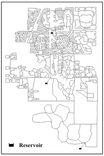 For demonstration purposes, the developed model was applied to a mid-size WDN, shown in Figure 4. The application network consists of three reservoirs, 1112 nodes, and 1459 pipes, and the total base demand of the system is about 50,370 m3/day. Note that there is no tank and pump installed in the application network. The size of the pipe ranges between 150 and 400 mm. The number of 150 mm pipes was 542, which is approximately 37% of the total number of pipes. The total number and length of pipes per diameter are summarized in Table 1.