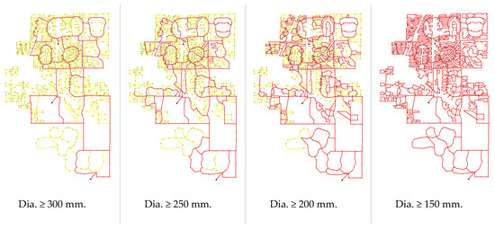 Network layout per pipe diameter (black dot = nodal junction, yellow line = pipeline less than the assigned diameter range, red line = pipeline within the assigned diameter range).