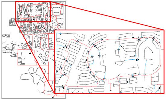 In addition, the valves can be installed at both ends of a pipe or only at one end. For both cases, the range of the service suspension area is different, and the number of valves to be installed also differs two-fold. To identify the impact of these differences, we investigated two cases, with “installation at both ends of a pipe” and “installation at the upstream end of a pipe”. Finally, to consider the segmented network, a case was added in which valves were installed on the main transmission pipes and the boundary pipes. As shown in Figure 6, the boundary pipes, where the valves are to be installed, are usually the pipes through which the water flows into a small block, specifying the boundary between the blocks, and branch from the main lines. Nine valve installation cases constructed for sensitivity analysis are summarized in Table 2. In Cases 1–4, valves were installed on both ends of a pipe; in Cases 5–8, valves were installed on the upstream end of a pipe; and in Case 9, valves were installed on the boundary pipes adding to Case 5.