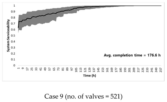 In analyzing the effects of the number of valve installations, it can be seen that in Cases 1, 5, and 6, where the number of valve installations is relatively small, the variance in serviceability is larger than that in other cases. The difference in restoration efficiency is large for individual seismic events; i.e., water serviceability is not ensured with such a low number of valves installed in the network. In addition, it can be seen that the decrease in system serviceability immediately after an earthquake is considerably large. This signifies that a large service suspension area is generated initially due to the small number of valves installed. By contrast, in Cases 2–4 and 8, the variance in serviceability (over the different earthquake events) decreases, and the system serviceability drop immediately after an earthquake also decreases significantly. This result implies that even in the various earthquake events, the network can cope with a certain restoration efficiency and is more stable in terms of system serviceability. Through these results, it can be confirmed that if a large number of pipes are damaged due to the earthquake, the number of valve installations has a significant impact on the system restoration.
