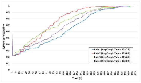 The second analysis compares and analyzes changes in restoration efficiency according to the restoration rules. For this analysis, the valve installation case should be fixed for each simulation. As shown in the previous analysis, there are no significant differences in restoration efficiency against the different instances of seismic damage in the cases with a large number of valves installed. Thus, Case 5, with the smallest number of valve installations, was used to see the differences in restoration efficiency according to the restoration rule.