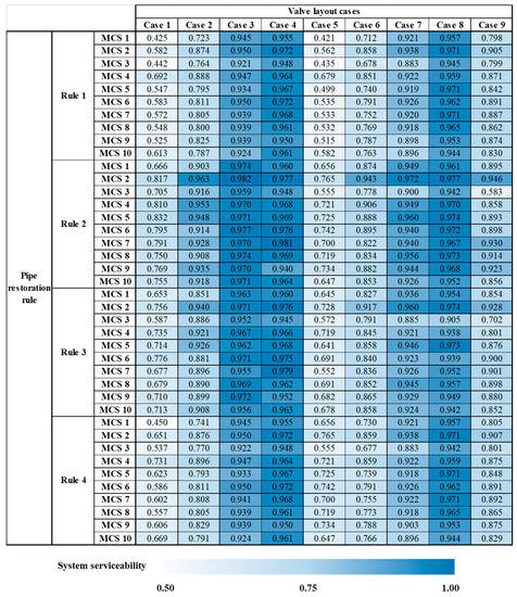 Figure 9 displays a heatmap showing the time-average system serviceability for all valve-layout cases, restoration rules, and seismic events (MCS). Note the time-average system serviceability indicates the average system serviceability from immediately after the earthquake occurrence until the restoration completion. The darker the color, the higher the system serviceability (damage restoration efficiency). Using this chart, the system serviceability can be intuitively identified according to the valve layout and restoration strategy. The most noticeable result is the difference by cases, regardless of the seismic events and restoration rules. The cases with more valve installations display darker colors (higher average system serviceability). In Cases 3, 4, 7, and 8, the average serviceability is over 0.9 for all restoration rules, possibly caused by the larger number of valves installed in the network leading to smaller service suspension areas under the seismic damage and a constant restoration efficiency. This high average serviceability implies that the corresponding valve cases can respond more easily to seismic damage with higher resilience. When comparing the average serviceability according to the valve installation positions, Cases 3 and 4, with valves installed at both ends of a pipe, show a slightly higher average serviceability than that of Cases 7 and 8, where valves are installed at the upstream end. However, as the difference between the two types of case is not large, it can be said that the efficiency is lower, considering the valve installation cost. Case 9 is judged to be the most cost-effective for the application network as it shows high efficiency considering the number of valve installations, by limiting the size of the service suspension area to small blocks at the early stages of the damage.