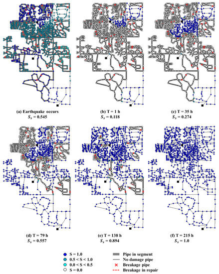 The developed model provides a spatio-temporal recovery map that visualizes the restoration progress of a network in time and space. Figure 10 illustrates the results of applying Case 5 for valve layout and Rule 2 for restoration strategy under the seismic event of MCS 1. From the system restoration curve and the spatio-temporal recovery map illustrated in Figure 10, it is easy to understand the overall restoration progress after a damage occurrence. Firstly, it can be seen that system serviceability decreases sharply between points (a) and (b). The time point (a) is immediately after the earthquake, and before the segment is isolated; thus, the water flows out through the damaged pipes, reducing the overall network serviceability. At point (b), all service suspension areas were isolated by shutting off the valves corresponding to the area containing the breakage pipes, resulting in very low water supply (system serviceability (Ss) = 0.118), because most of the network was isolated (except for some areas in the north and south). As the restoration of the damage pipes proceeds, the system serviceability increases from point (c) through (f). The system serviceability curve shows a gradual increase with time; in particular, at time points (c) and (d), which are at the early stages of restoration, the curve shows a rapid increase. These results are evident in the spatio-temporal recovery map. The rapid increase is due to the release of water suspension after the repair of the large service suspension area is completed at that time point. Subsequently, service suspension areas with relatively small sizes were continuously restored, and at about 138 h after the start of the restoration (point (e)), approximately 90% of the water supply was restored. Finally, all restorations were completed by about 215 h after the recovery initiation (point (f)). The spatio-temporal recovery map can assist the system managers in assessing the expected service suspension area, expected restoration completion time, serviceability at individual nodes, and restoration progress of the entire network over time after an earthquake. Using these features, the model can be used as a decision-making tool for various purposes, such as pre-reinforcement planning in areas where high water suspension is anticipated by installing additional valves, and planning to prioritize critical areas (hospitals, government offices, factories, etc.) within the network by a criticality-based network restoration strategy.