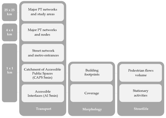 For Jacobs [29], access is more about the permeability enabled by ‘short blocks’, which mediates walkable access to diverse urban attractions; from her point of view, multiple options of public spaces with intensive interconnections encourage intensities of streetlife and economic productivity. Permeability is linked to the notion of ‘pools of use’ [29] to indicate the functions accessible within a walkable catchment of a specific location measured by time or distance. An effective urban pedestrian network is often normatively identified by block length of about 60–90 metres [30] and a maximum of about 100 metres [29]. Very small block lengths can also inhibit potentials for density and active urban frontages [31].