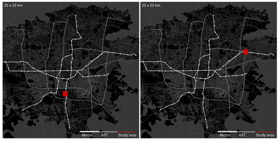 There has been an emerging view among urban scholars for reimagining the city by learning from the cities of the global South. This way of thinking argues against any attempts that have remained entrenched in studying the cities of the global North, which often act as a framework against which other cities are judged. The questions that become important are then related to the ways in which learning from cities beyond the global North can contribute to the debates in transit urbanism. Such cities, from Asian metropolises to small, rapidly urbanizing regional hubs in Africa, vary significantly in relation to transit mobilities and walkable urban form [22]. This degree of variation can complicate any generalisation about the global South or any categorisation into transit city types according to geography, urban morphology, size or intensification pattern. However, demonstrating trends by transit city type as well as categorising by urban morphology can not only outline some of such differences but also create a framework based on which mobilities and walkable station areas can be discussed in the global South. This research adopts an ‘information-oriented’ approach [71] for selecting Tehran as a ‘critical’ case in the context of the rapidly urbanising cities that face significant challenges of coordinating rapid transit networks and walkable neighbourhoods [72,73,74]. Two study areas were selected, comprising a 100-hectare district within walkable distance of the metro stations. This selection aimed at building a framework based on the ‘maximum variation’ rationale [71], incorporating a broad range of transport modes/networks, urban morphologies, and streetlife intensity. The study areas are located in different parts of the city (Figure 2)—Shoosh in the South and Sarsabz in the East. This links to how a north–south divide in Tehran has been manifested in its social and physical structures.