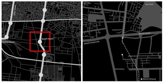 Shoosh station is located in the southern part of Tehran, about 1.5 km east of the city’s main railway station and less than 1 kilometre away from the southern terminal of the city, which operates as a key bus hub for intercity travel (Figure 3). The population density in the station area is lower than the average in the city, which is about 92 people per hectare [78]. To the southwest, Tehran’s main intercity train line passes through the area, adjacent to a large area of the train depot. While the reference area is close to Tehran’s beating heart, it is on the periphery of society. Its network of twisting lanes is generally filled with deprived and impoverished buildings occupied by lower-middle-class and working-class people; the poorer residents of the area, such as families of illegal immigrants and gipsies often squat in abandoned and dilapidated houses. It has been argued that this is a piece of the dysfunctional station area, often characterised by a low mix of mixes—mono-functional areas, low building and residential densities, the impermeable structure of urban spatial networks and low intensity of streetlife [25].